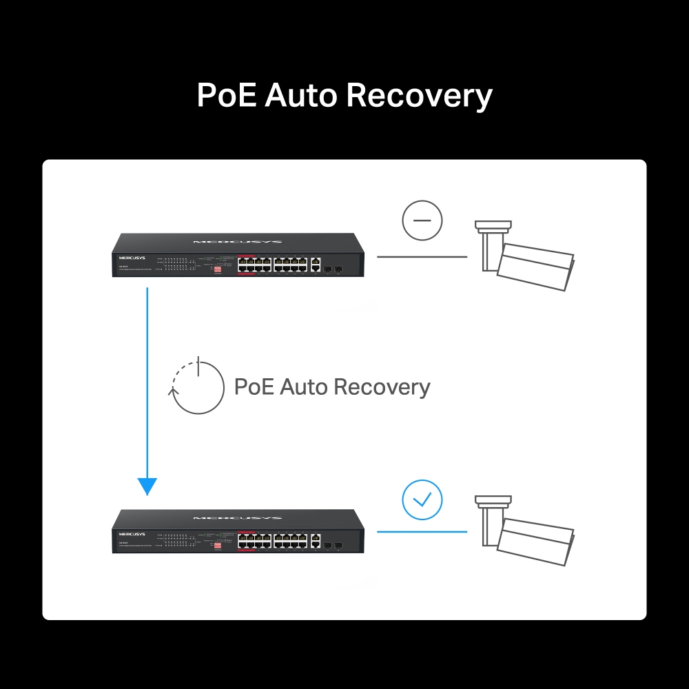 - Tính năng Tự động Khôi phục PoE đảm bảo hoạt động ổn định bằng cách tự động khởi động lại các thiết bị PD bị treo hoặc không phản hồi