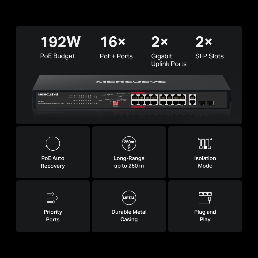 Đặc điểm nổi bật Switch 16 Cổng PoE+ Mercusys MS120GP