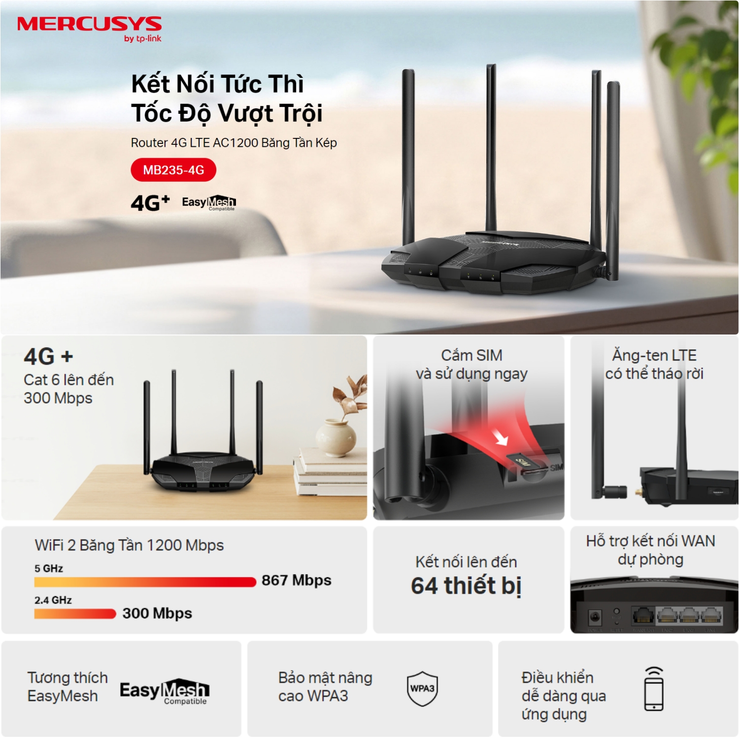 Router WiFi Mercusys MB235-4G AC1200 Gigabit Băng Tần Kép Hỗ Trợ 4G+ Cat6