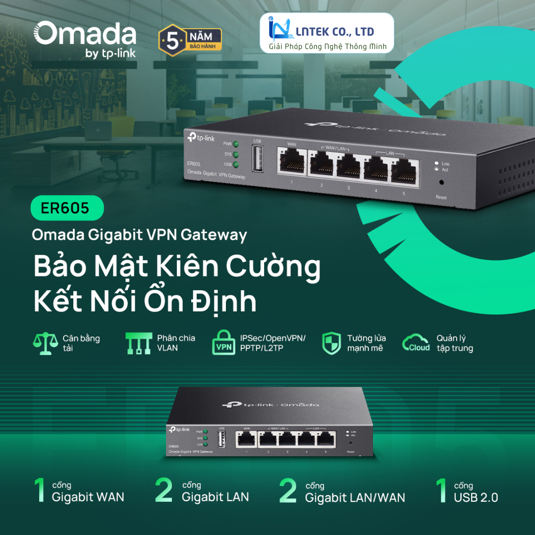 TP-Link Omada ER605 là router cân bằng tải Gigabit chuyên nghiệp, thuộc hệ sinh thái Omada SDN, được thiết kế cho doanh nghiệp vừa & nhỏ, văn phòng, quán café, khách sạn, trường học, hệ thống camera. Sản phẩm hỗ trợ multi-WAN, quản lý tập trung qua Cloud, bảo mật cao và hiệu suất ổn định 24/7.