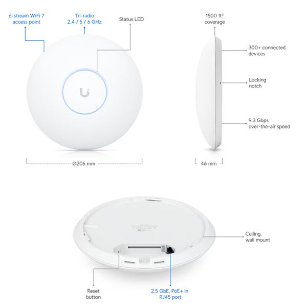 - Các tính năng nổi bật: Multi-Link Operation (MLO), WPA3, Wi-Fi scheduler, Band steering, VLAN tagging, AirTime Fairness, IDS/IPS (qua UniFi Gateway)